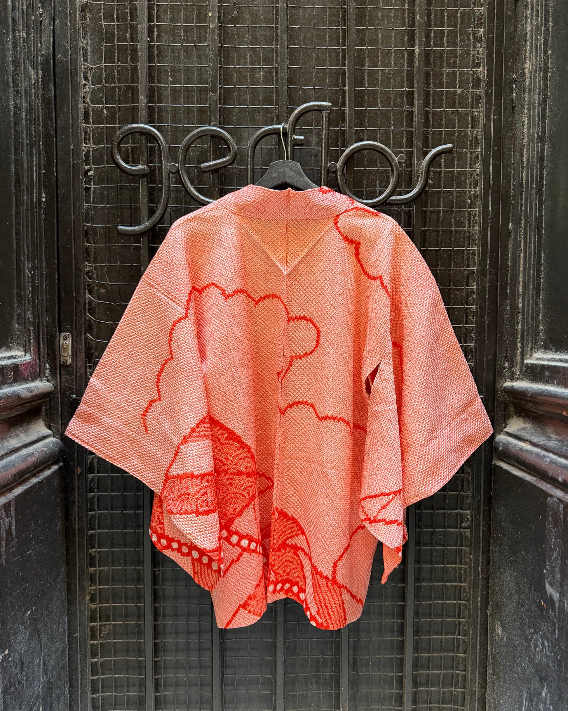 This almost neon orange haori showcases a shibori texture, accented with hand-dyed curved lines creating cloud-like pattern. Inside lining features silk with painted contrasting flower patterns - highlighting the artistry and craftsmanship behind the piece.