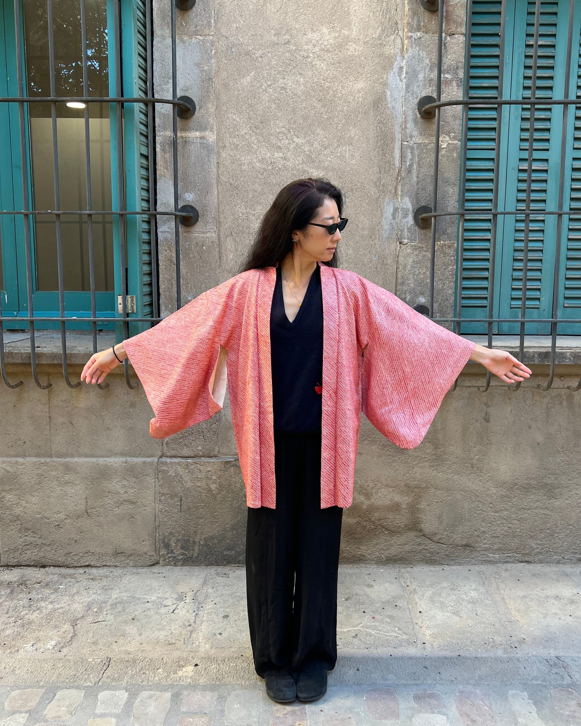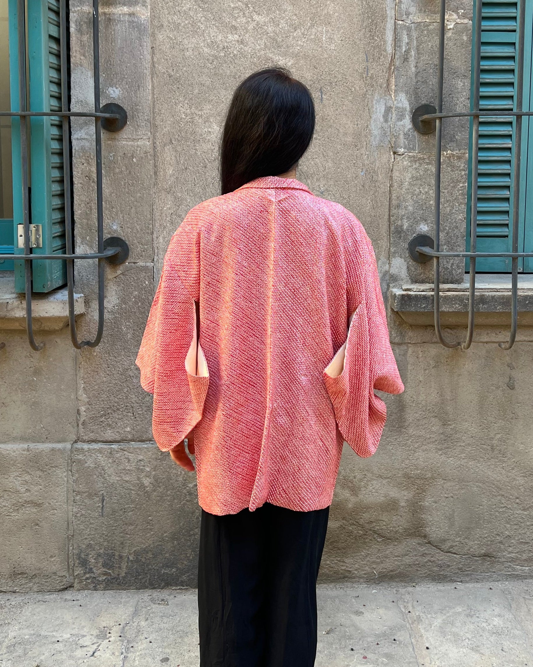 This bright red haori showcases a shibori texture, Inside lining features silk jacquard painted with contrasting flowers - highlighting the artistry and craftsmanship behind the piece.