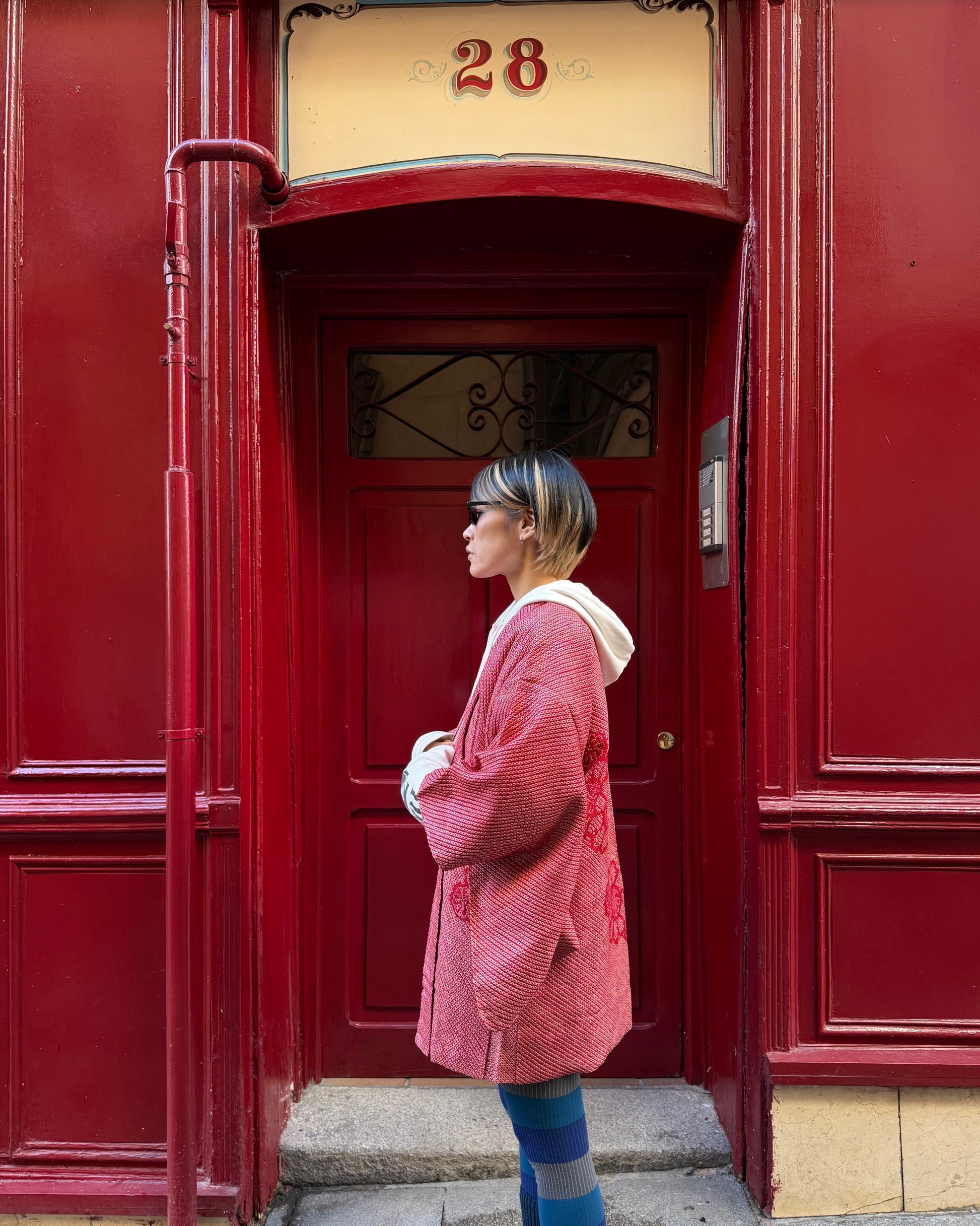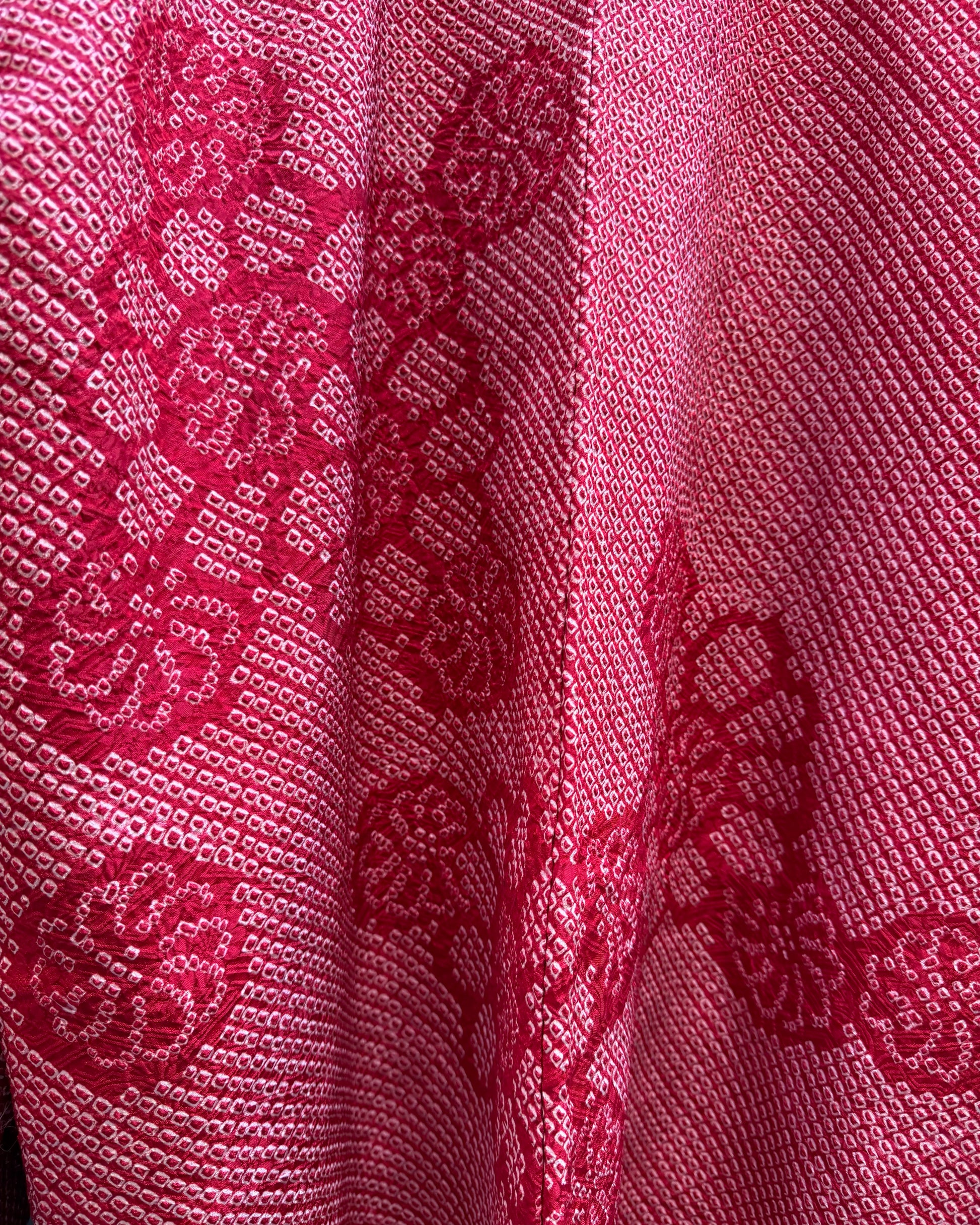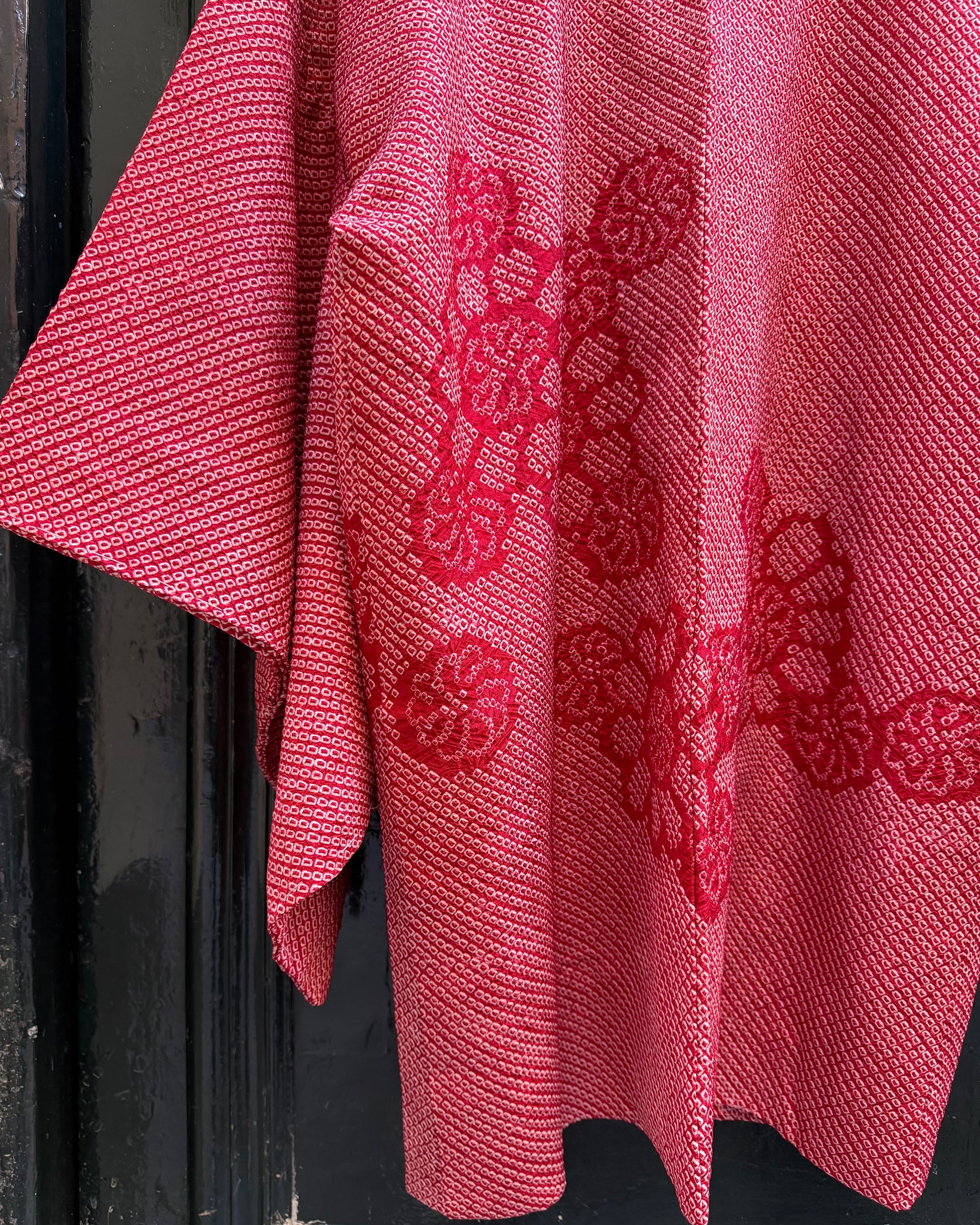 This red haori showcases a shibori texture, accented with hand-dyed curved lines creating floral pattern. Inside lining features silk with painted contrasting flower patterns - highlighting the artistry and craftsmanship behind the piece.
