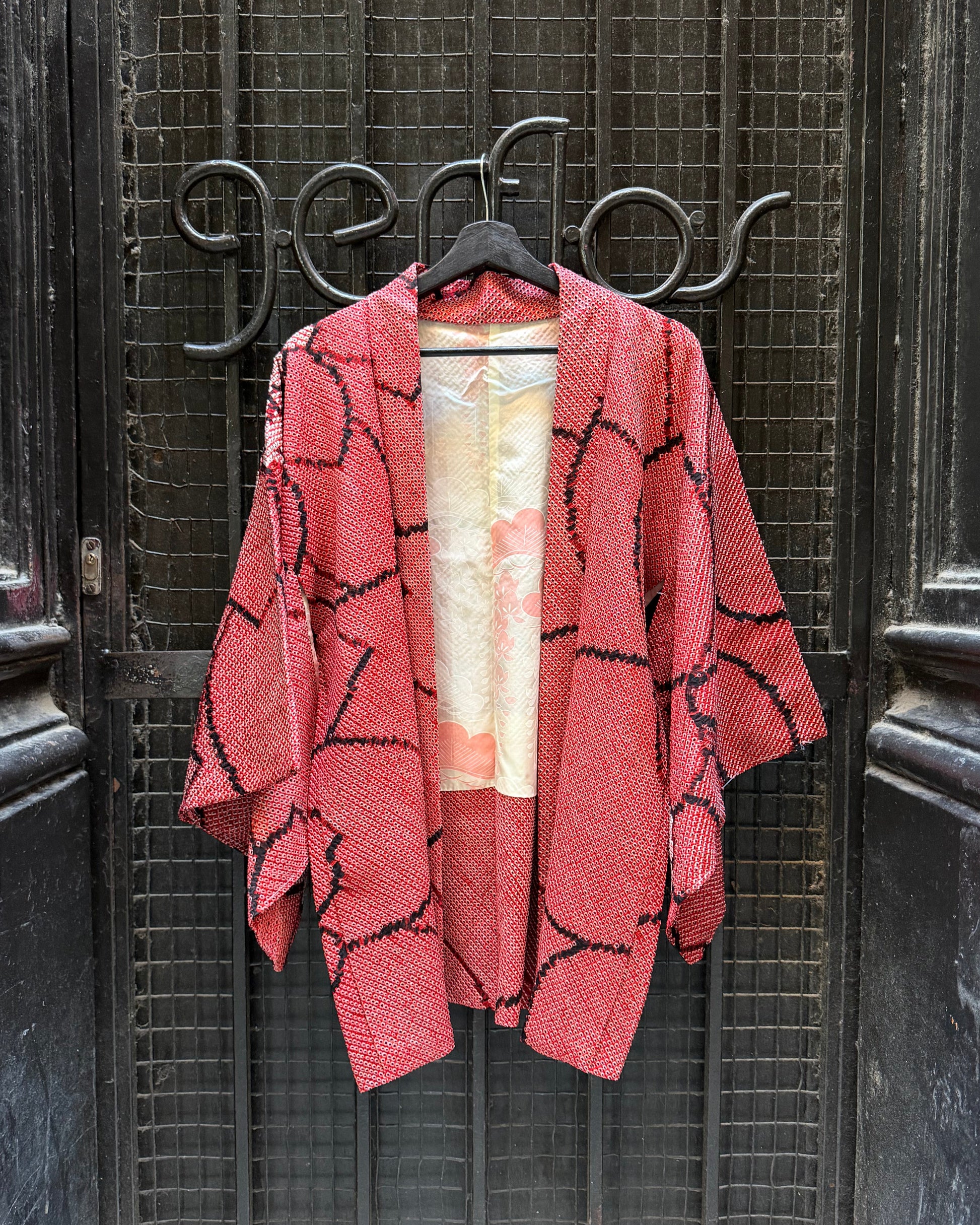 This red haori showcases a shibori texture, accented with hand-dyed curved lines creating large flower patterns. Inside lining features silk with painted contrasting flower patterns - highlighting the artistry and craftsmanship behind the piece.